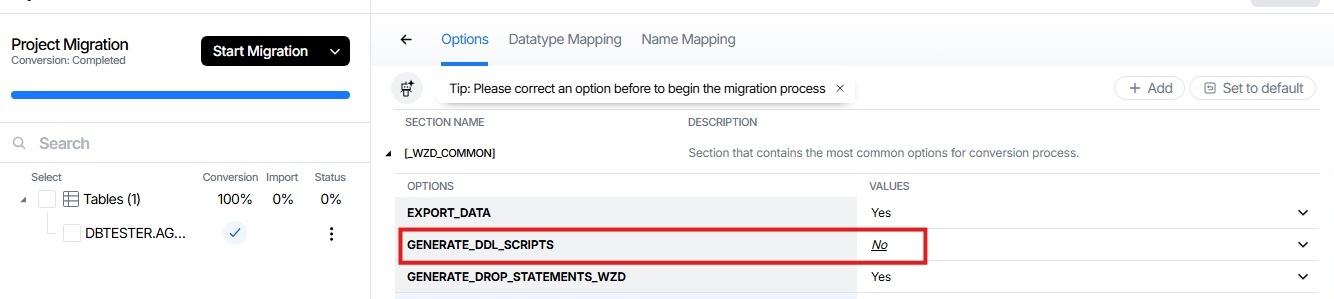 Please, also note that you should uncheck 'GENERATE_DDL_SCRIPTS' option at the section “DDL” for processes other than the first one to avoid error of table existence. In this case only data will be migrated.