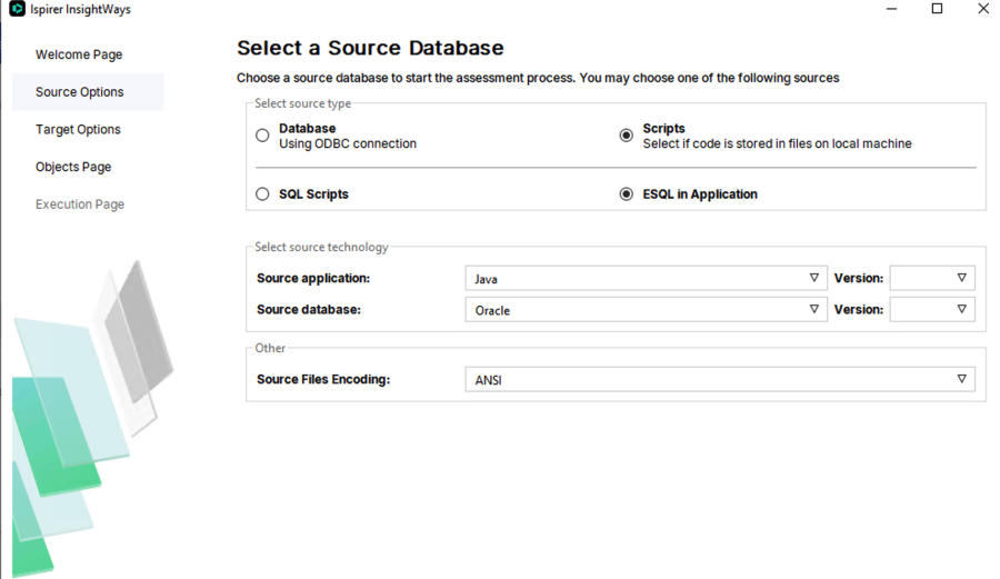If you need to analyze SQL scripts or application code containing Embedded SQL, select the “Scripts” option. Then choose one of the two available options: SQL Scripts or ESQL in Application.