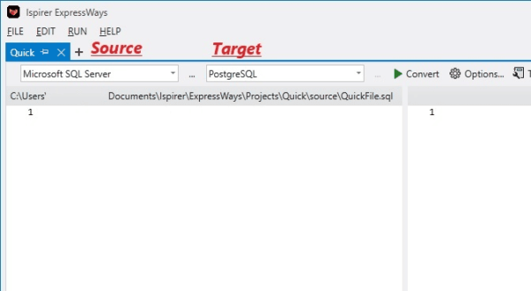 Go to the “FILE” menu and select “New Conversion” or use the Ctrl+Q keyboard shortcut. A new tab named “Quick*” will be created in the editor.