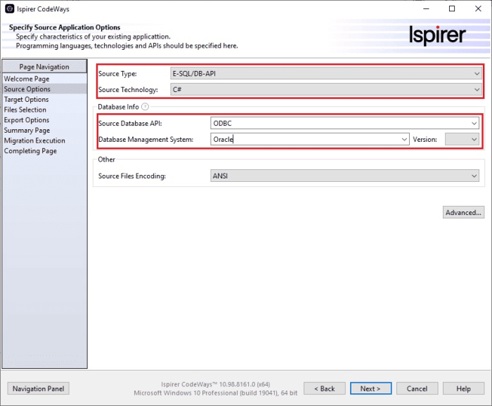Additional parameters characterizing the source system should be specified on this page: source DBMS, source database API (for application, E-SQL/DB-API conversions) and some other possible advanced parameters.