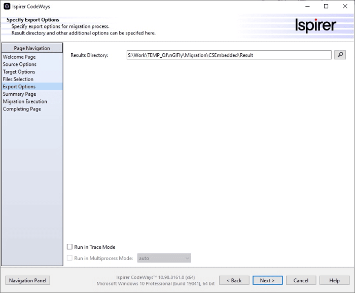 On the Export Options page, you can specify the directory where the results of a particular conversion will be placed. Use the new results directory if you do not want to overwrite previous conversion results. To do this, change the path specified in the text editing field “Results Directory“. You can enter it directly into the text field.