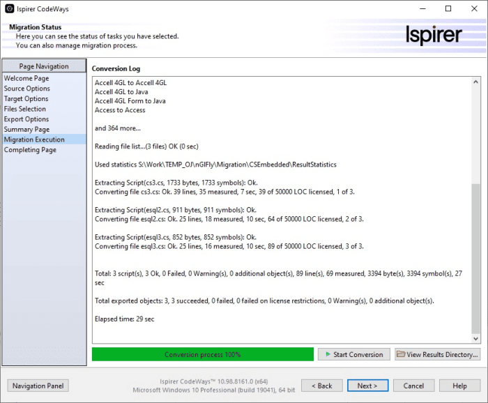 Once the migration process is complete, you can view all the generated files in the export directory by clicking the “View Results…” button. This will open a folder with all the conversion results along with the log files (sqlways.log). The sqlways.log file stores detailed information about the conversion phase. This log file, along with a trace file (the sqlways.trc file, which can be enabled on the Export Options page), can help the Ispirer support team understand some of the issues you may encounter during conversion. If you have any problems, please contact us at support@ispirer.com.