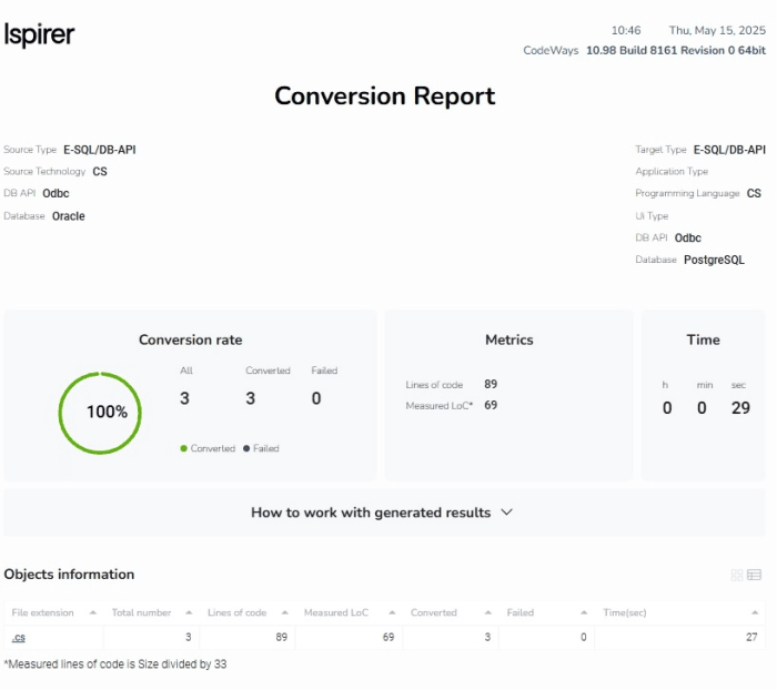 An example of the CodeWays conversion report: