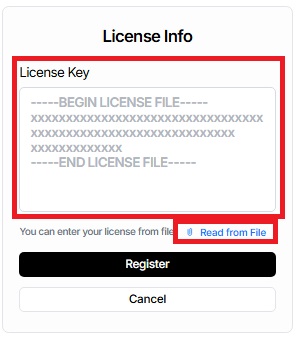 5) In the appeared “License Registration” dialog, you can set up the License Key or just click the “Read From File” to launch the License as file.