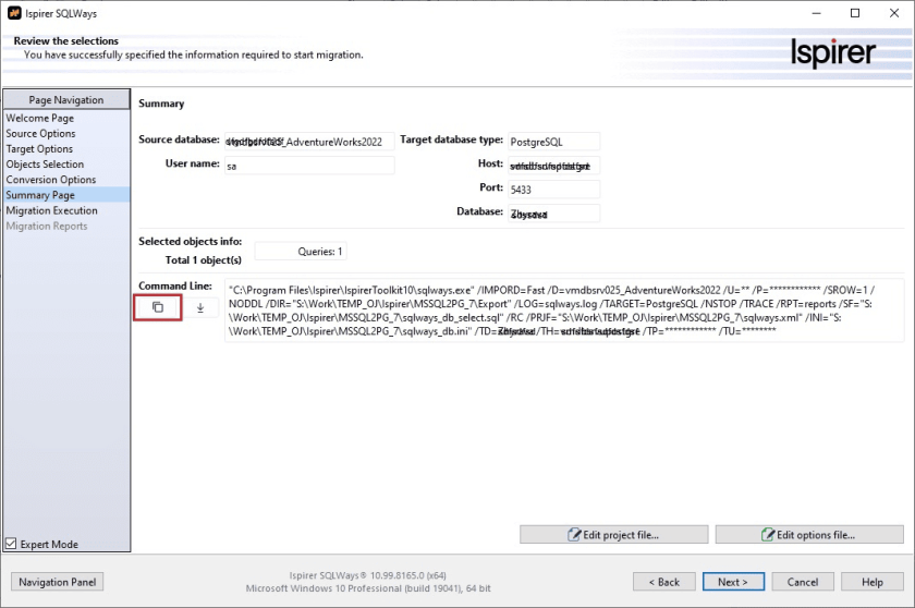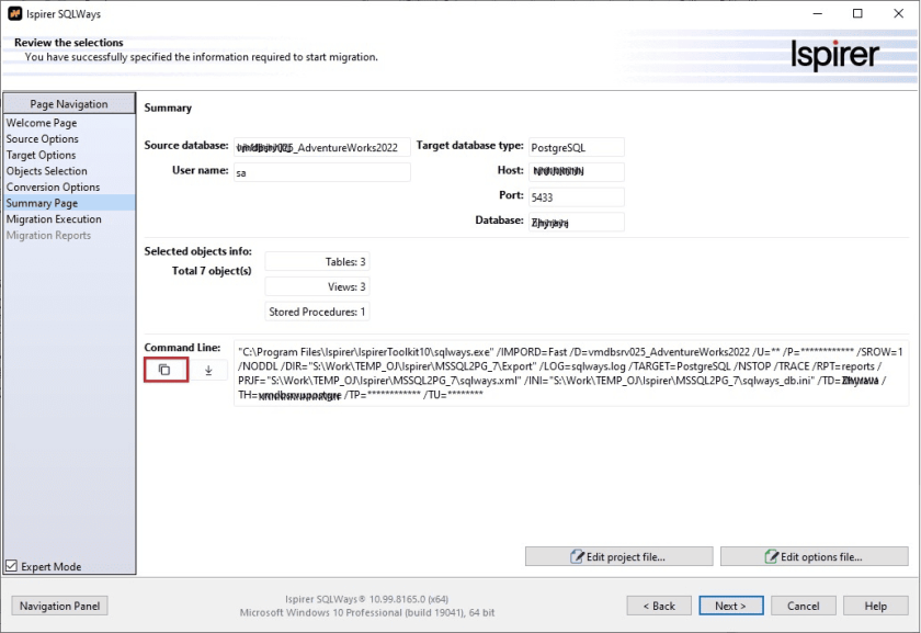 6) Start the conversion and copy the Import command from file in export directory: