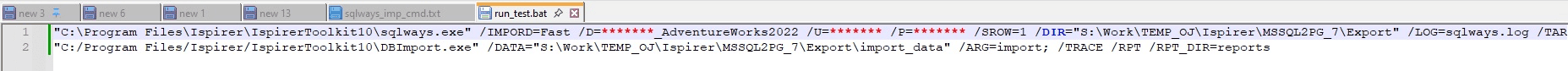 6) As a result, we should get the following .bat file (the 1st line is the conversion command, the second one is the import):