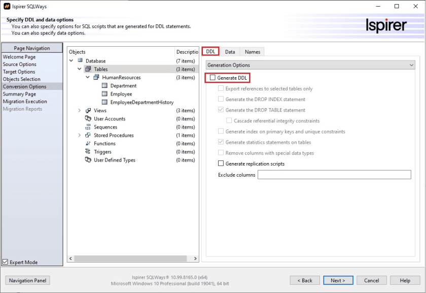 2) Uncheck the “Generate DDL” option (the table should already be converted):