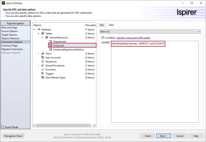 3) Specify the “Data Cut” condition using the WHERE condition and the source SQL language - in the example we will copy the data from the previous day, but you can select a time period as well: