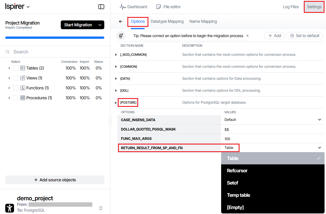 Which option to use in the conversion process? It depends entirely on the needs of your database and application. We always recommend starting conversion by using the default options. However, if your database has a large number of procedures that return resultsets and many of their calls from the application, we recommend using conversion through refcursors, since this option preserves the object type (procedure) and simplifies the work of changing the application.