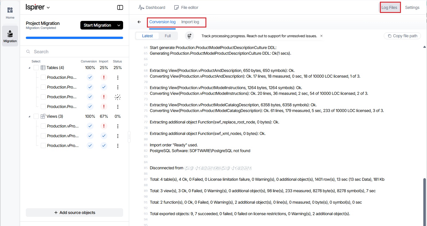 Once the conversion is complete, the primary objective is to identify which objects were not imported and understand the reasons for any issues. To do this, you can: