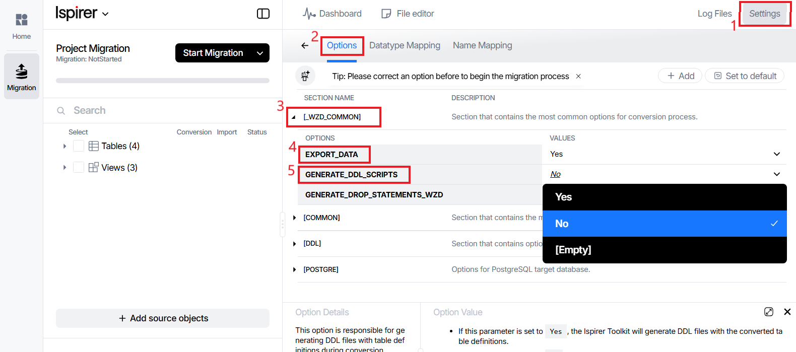 - No — Data export will be skipped (only schema/object conversion may occur).