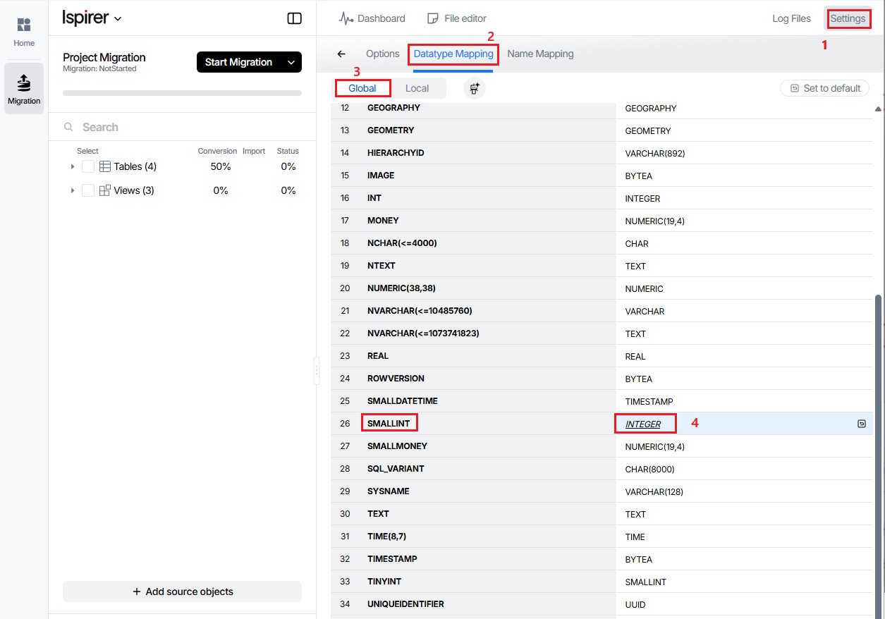 SQLWays Beta (web-based) supports flexible data type mapping, allowing column data types to be modified either globally across the entire database—including tables, variables, and parameters—or locally for selected tables only. To accommodate different migration strategies and levels of control, the tool provides two distinct data type mapping approaches. The following sections describe global data type mapping and local data type mapping, along with the scenarios in which each approach is most appropriate.