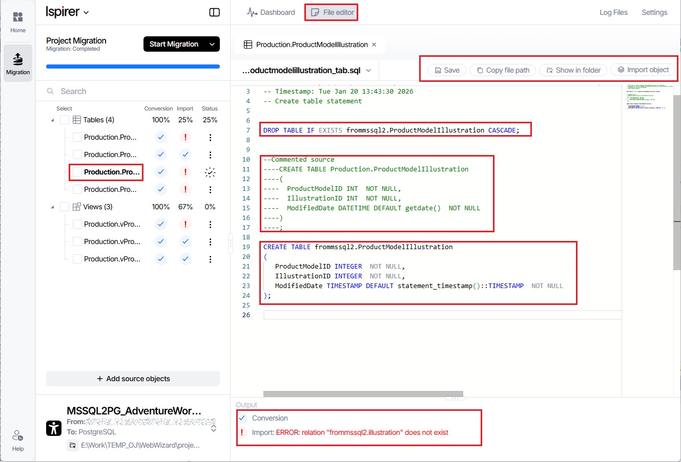 If you select any object in the object tree, its corresponding .sql file, created during the Export phase, will be opened on the File Editor tab.