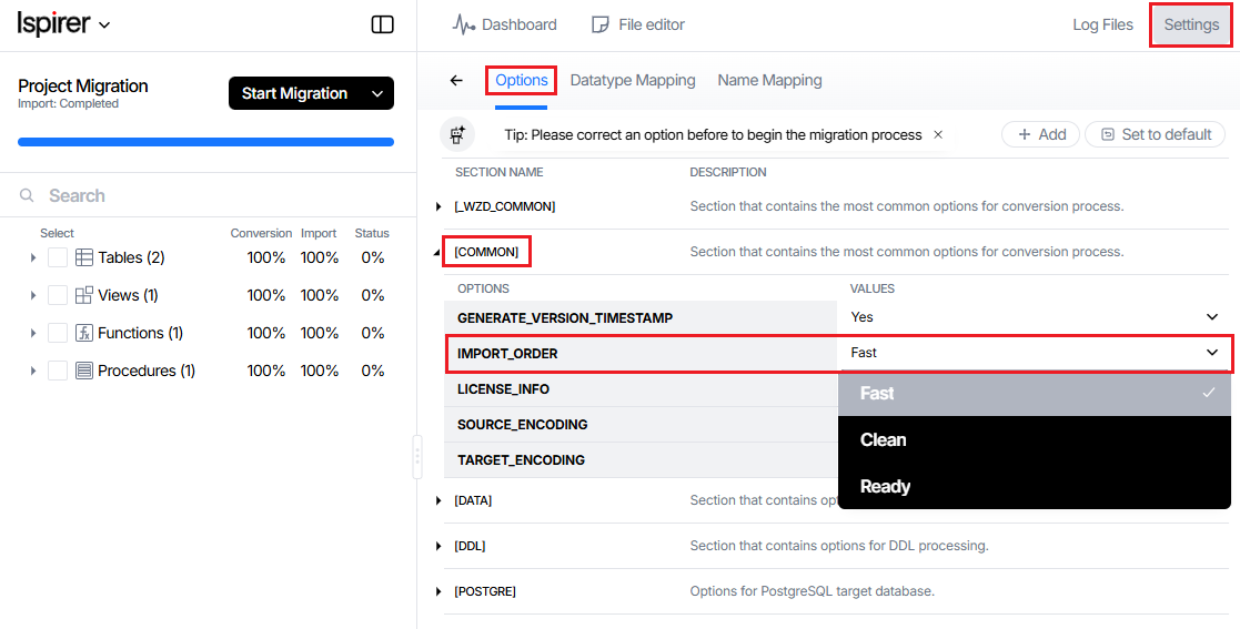 By default the tool uses Fast import order.