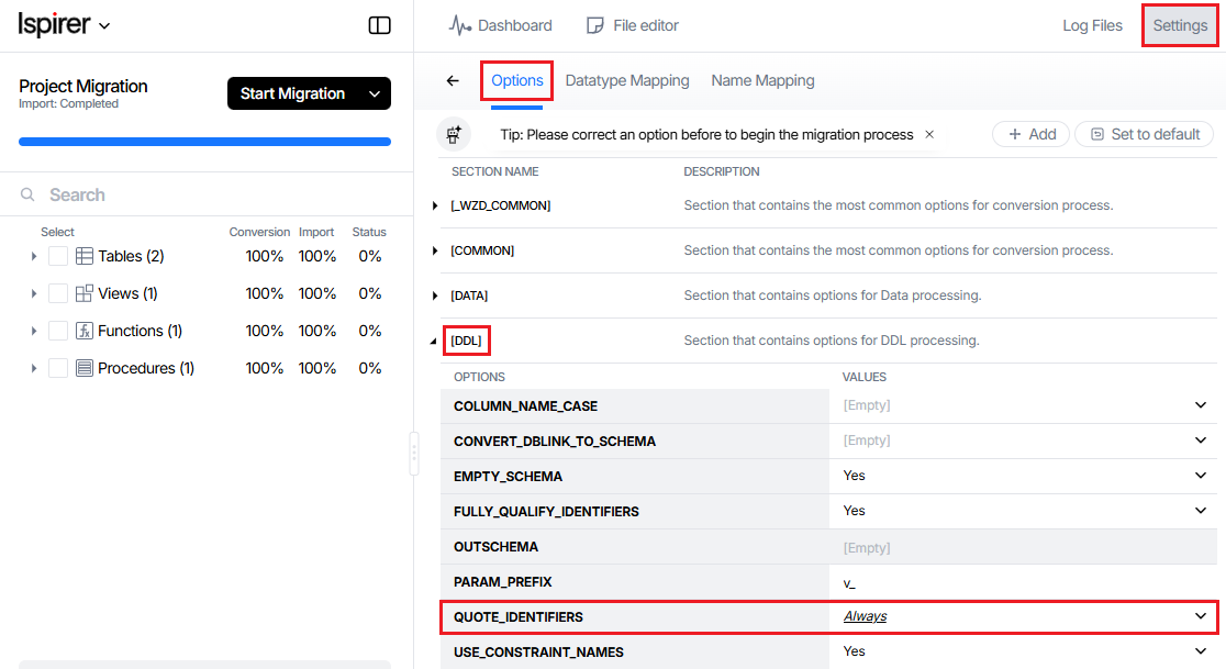 This setting instructs the tool to quote all identifiers, thereby preserving their original case from the source database. Once this is configured, please run the conversion again, and the resulting PostgreSQL objects should retain their original names exactly as defined in MS SQL Server.