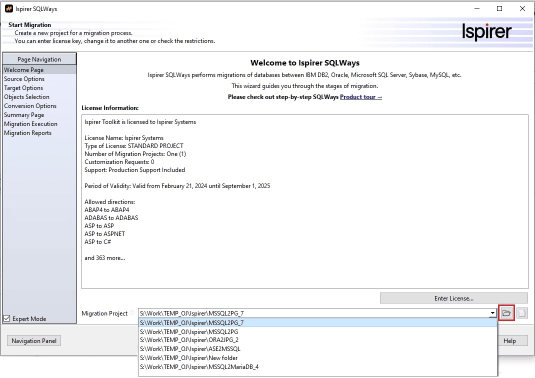 - Open an existing migration project via drop-down list or by clicking the “Open” button .