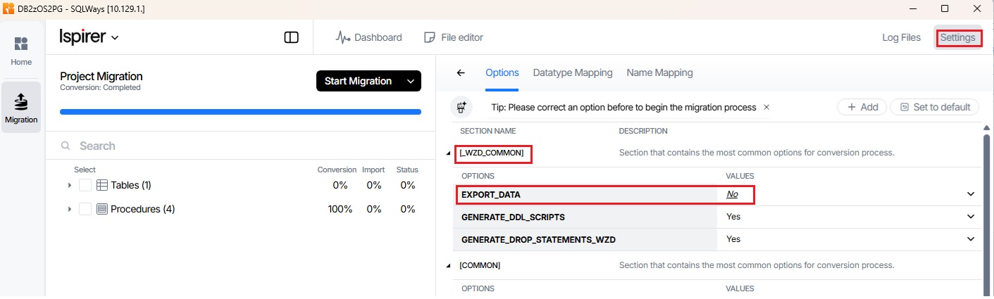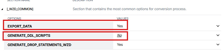 Next, navigate to Settings → Options and configure the EXPORT_DATA option in the _WZD_COMMON section to No.