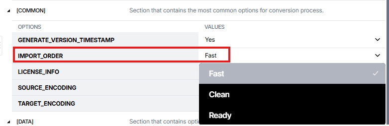 Next, verify that in the COMMON section, the IMPORT_ORDER parameter is set to Fast (this is the default value).