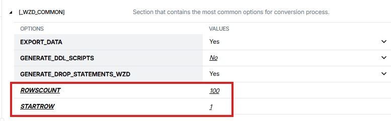 If only one table is selected for conversion, you can specify the initial row and the number of rows to load in the _WZD_COMMON section in Settings → Options.
