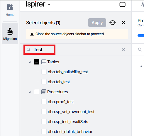 The Search Filter on the Source Objects Panel of SQLWays (Beta) Web is used to quickly locate source database objects in projects with a large number of schemas and objects.