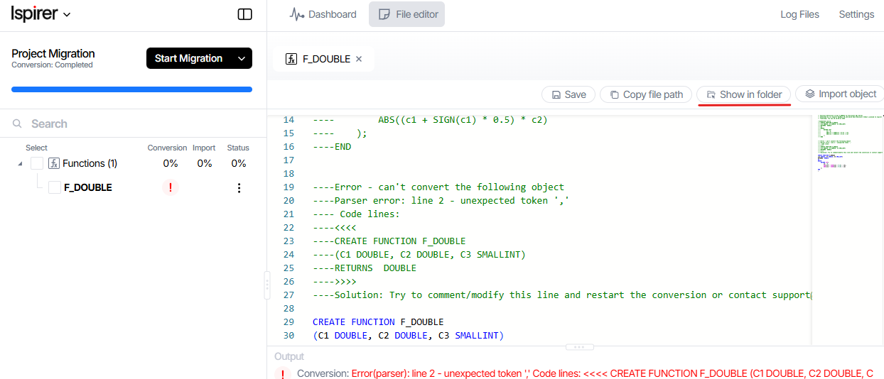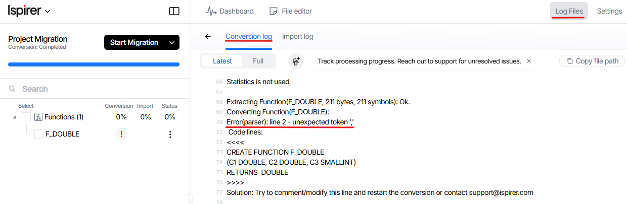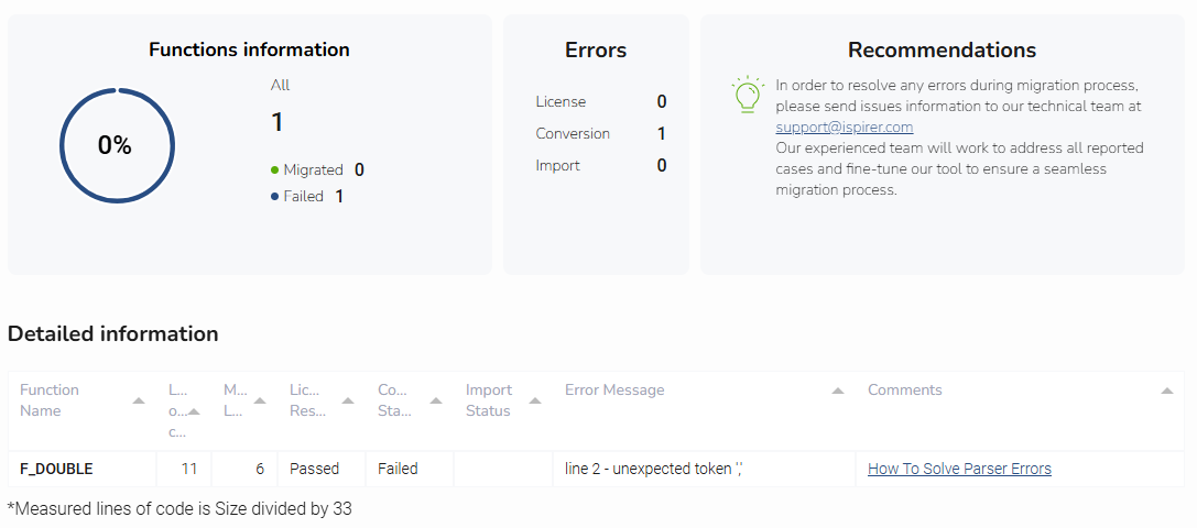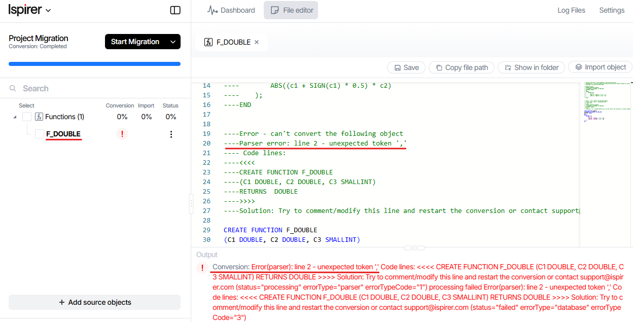 All you need to do is simply send the code of failed objects or scripts to our support team at support@ispirer.com. And we will extend the parser technology based on the constructions of your code for free. In a couple of days we will provide you with an extended version of the toolkit. Therefore, you can continue to use the migration tool.