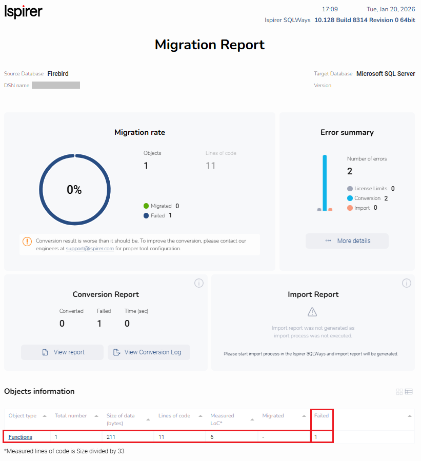 For the convenience of viewing error messages, SQLWays Beta (web based) provides the opportunity to view a full report with the results of the conversion.